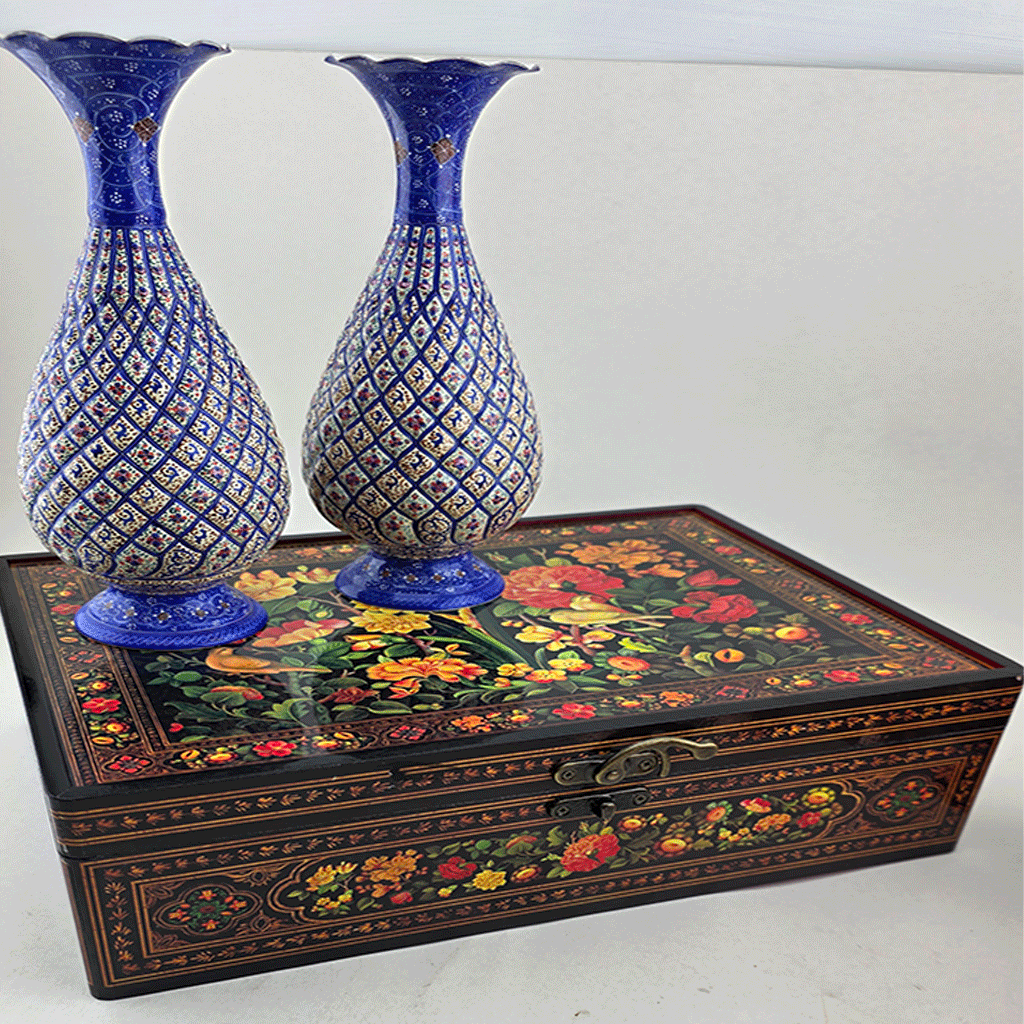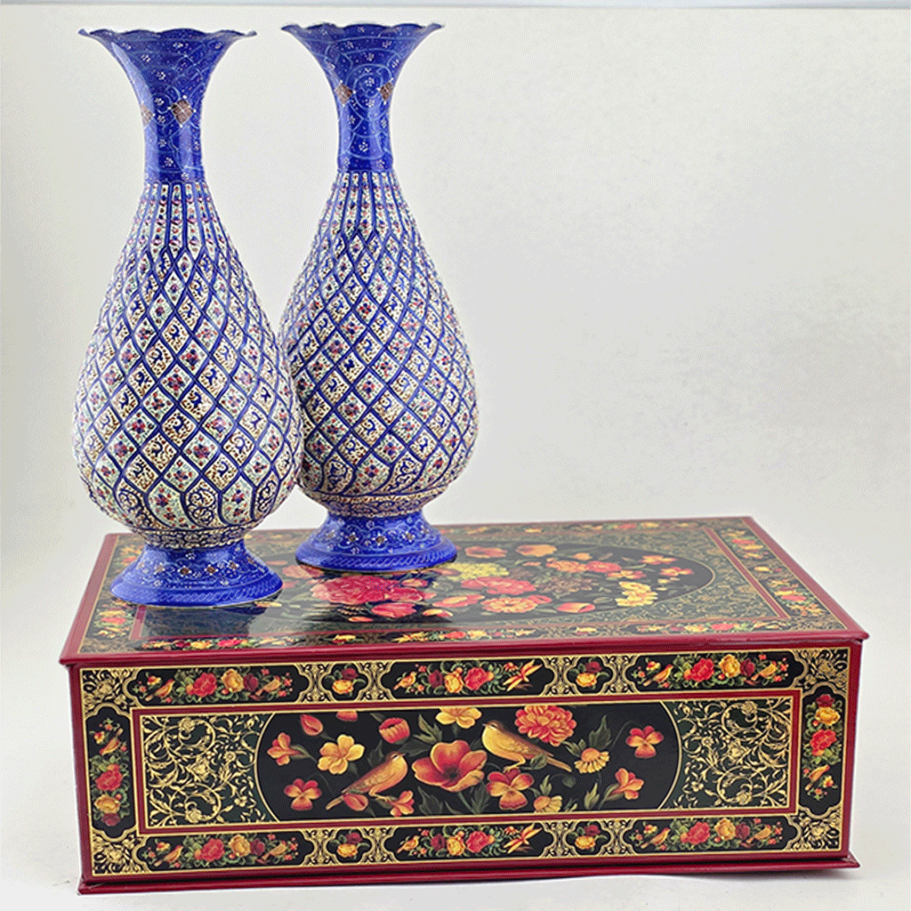 دو عدد گلدان مینا کاری با جعبه چوبی در سه سایز مختلف