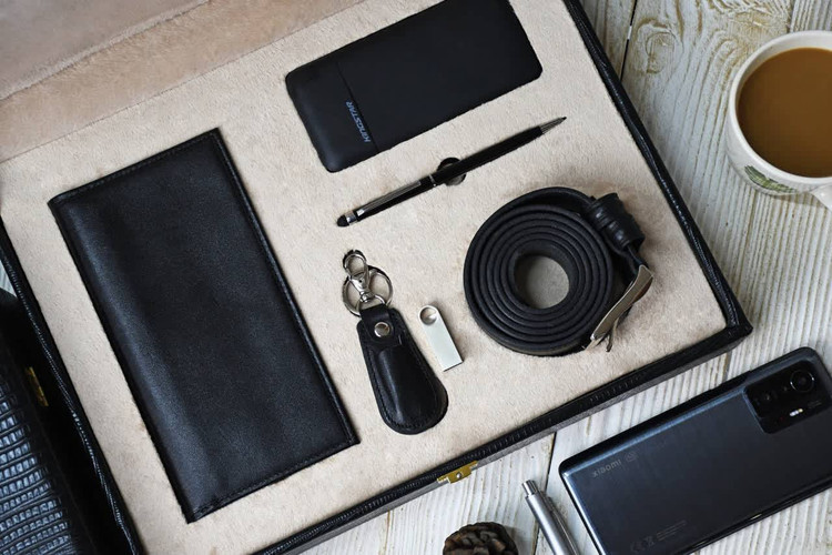 پک چرمی دیپلمات با رنگ مشکی کلاسیک و طراحی رسمی، انتخابی شیک و ارزشمند برای هدایای مدیریتی و سازمانی است. این مجموعه شامل کمربند چرمی، کیف پول چرمی، جاسوئیچی چرمی، خودکار و پاوربانک بوده که با ترکیبی کاربردی و هماهنگ، هدیهای لوکس و ماندگار برای مدیران و مشتریان ویژه به شمار میآید و بیانگر سلیقه و اعتبار برند شما خواهد بود.