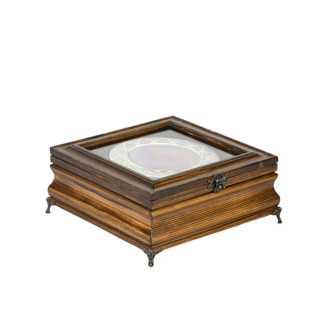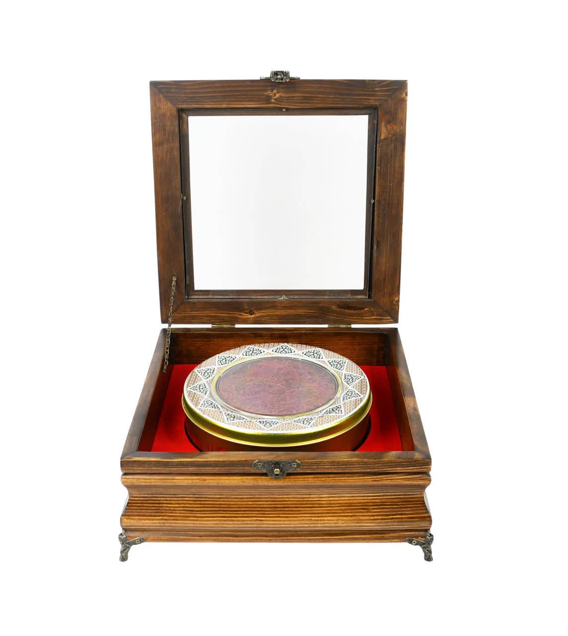 جعبه چوبی دستساز و فاخر با درب شیشهای و جزئیات ظریف، همراه با آستر مخمل قرمز که جلوهای شاهانه به آن میبخشد.