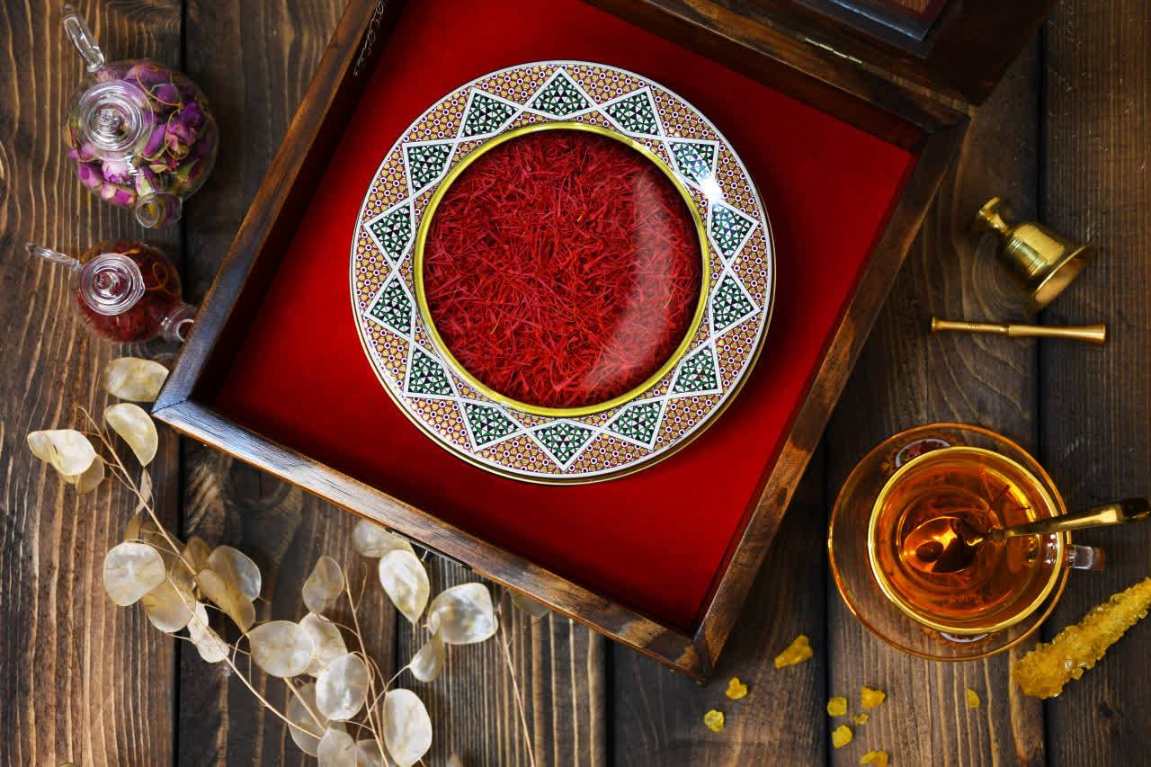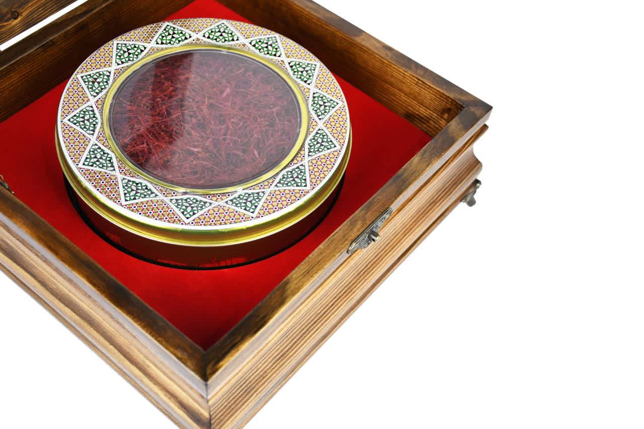 قوطی فلزی دایرهای شکل و تزئینی، مزین به نقوش اصیل، حاوی زعفران اعلای ایرانی که با عطر بیمانند خود، حسی از شکوه و طراوت را هدیه میدهد.