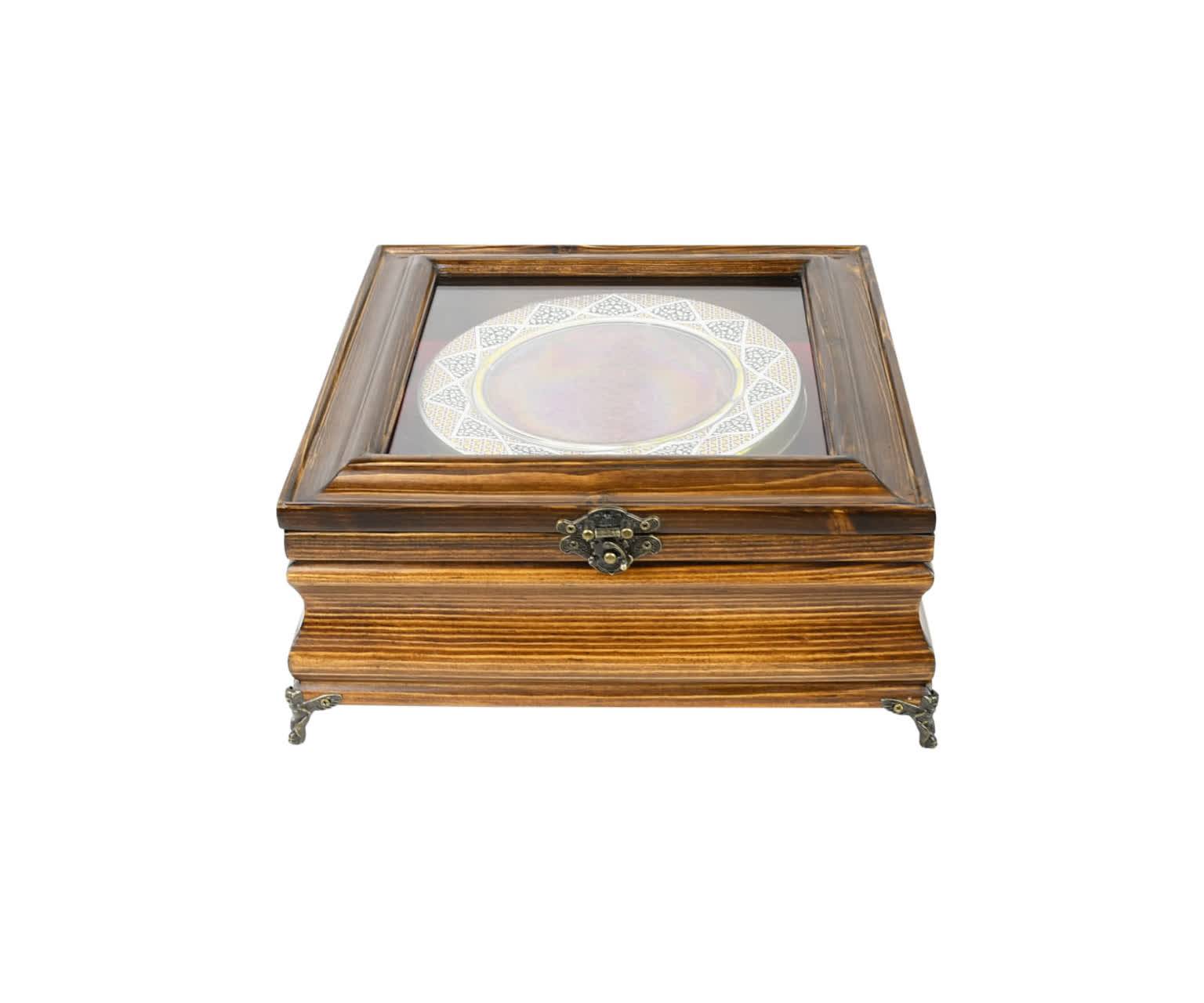 جعبه چوبی دستساز و فاخر با درب شیشهای و جزئیات ظریف، همراه با آستر مخمل قرمز که جلوهای شاهانه به آن میبخشد.