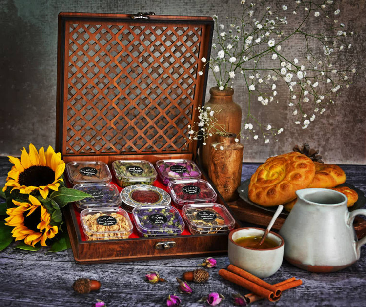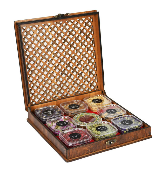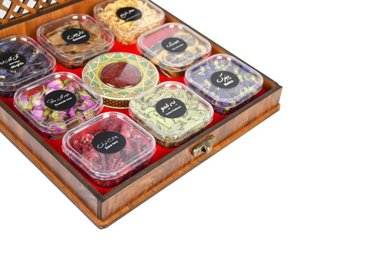 در این پک، چندین محفظه از دمنوشهای گیاهی متنوع شامل ترکیباتی از گلها، میوهها و گیاهان معطر در کنار ظرف زعفران در مرکز مجموعه قرار گرفتهاند که عطر و اصالت ویژهای به این ترکیب میبخشند. تمامی اقلام درون جعبه چوبی دکوراتیو با درب مشبک سنتی چیدمان شدهاند که جلوهای اصیل و چشمنواز به این مجموعه میدهد.