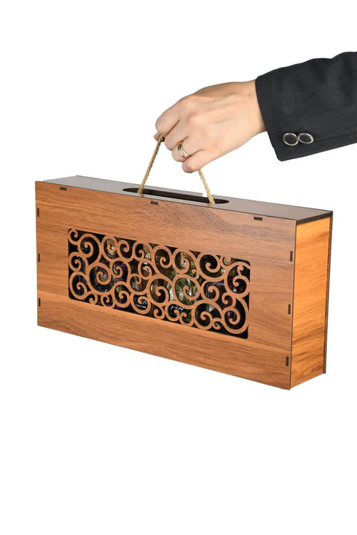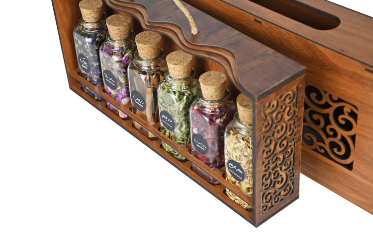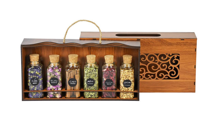 در این پک، چندین شیشه دمنوش گیاهی متنوع شامل ترکیباتی از گلها و گیاهان معطر در کنار یک جعبه چوبی دکوراتیو با برشهای سنتی و دسته کنفی قرار گرفتهاند. طراحی خاص این جعبه علاوه بر محافظت از محتویات، جلوهای اصیل و چشمنواز به مجموعه میبخشد و آن را به هدیهای ماندگار تبدیل میکند.