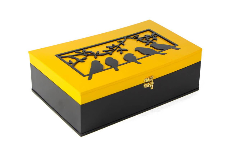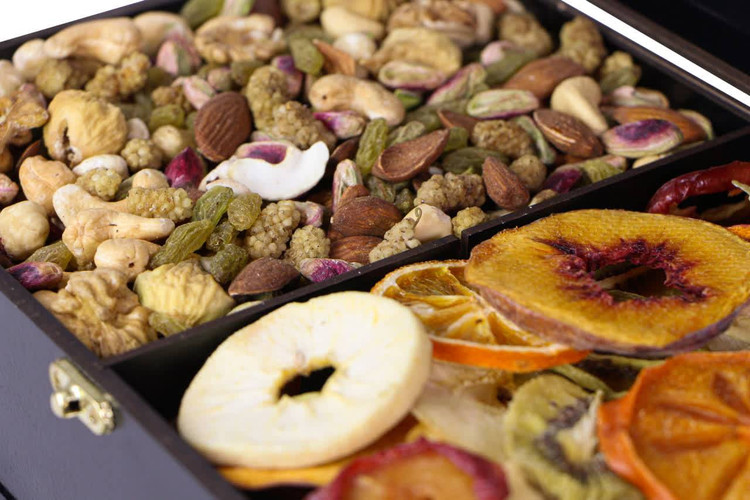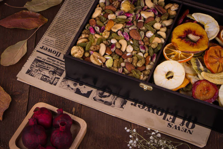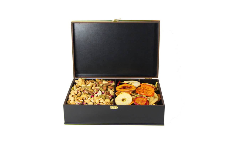این مجموعه، با الهام از زیباییهای پاییز، ترکیبی بینظیر از طبیعت و هنر را به ارمغان میآورد و برای هدیه دادن در مناسبتهای خاص یا افزودن جلوهای لوکس به پذیراییهای شما بیبدیل است. در این پک فاخر، جعبهای از چوب نفیس با طراحی خاص و نقوش برجسته پرندگان بر شاخسار، که در ترکیب رنگی مشکی و زرد پاییزی جلوهگری میکند، مجموعهای از آجیلهای منتخب و مرغوب را در کنار خشکبار دستچین شده و رنگارنگ فصل در خود جای داده است.