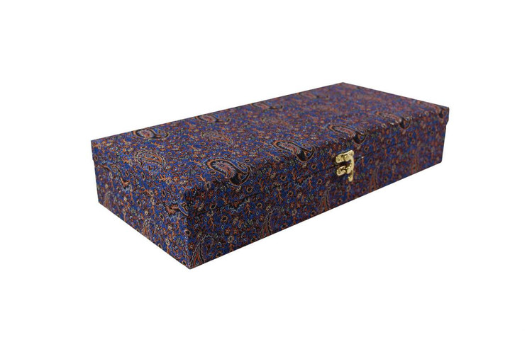 این جعبه فاخر، با پوششی از پارچه سرمهای با طرحهای بتهجقه و گلوبلبل گلابتوندوزی شده طلایی، زیبایی خیرهکنندهای دارد. قفل طلایی آن، جلوه لوکس جعبه را تکمیل میکند. فضای داخلی جعبه با مخمل سرخفام آستر شده و چهار بخش مجزا را در خود جای داده است. این چیدمان، برای ارائه چهار نوع از مرغوبترین و تازهترین آجیلهای دستچین شده، از جمله پسته و بادام، به شیوهای منظم و دلپذیر طراحی شده است.