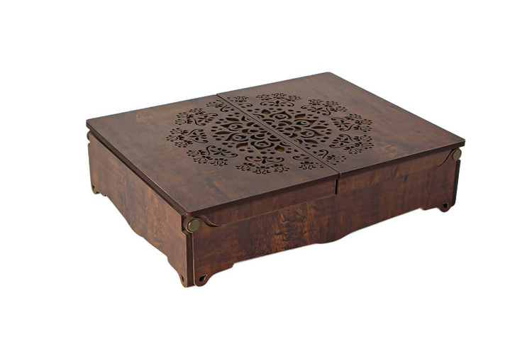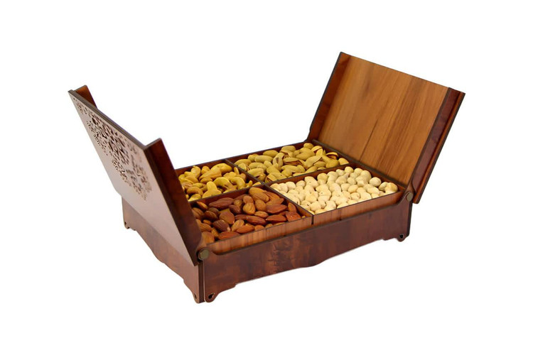 پک مانا نمادی از سادگی و شکوه در کنار هم است؛ جعبهای چوبی با طراحی هنرمندانه و ظریف که چهار بخش مجزا برای انواع آجیلهای درجه یک دارد.