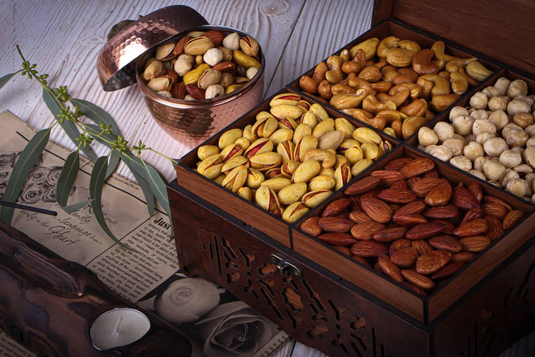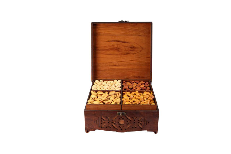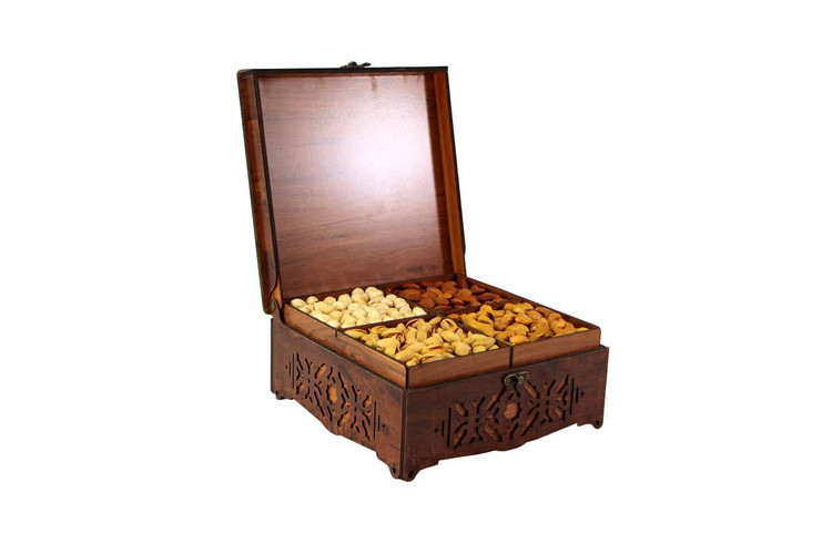 در این مجموعه، چهار بخش مجزا از آجیلهای منتخب ایرانی شامل پسته، بادام، بادام هندی و فندق با دقت و کیفیت بالا در کنار یکدیگر قرار گرفتهاند. تمامی محتویات درون جعبهای چوبی با طراحی مشبک و الهامگرفته از نقوش اصیل ایرانی جای گرفتهاند که علاوه بر زیبایی بصری، حس گرما و اصالت هنر ایرانی را به این مجموعه میبخشد. درب حکاکیشده و ساختار مستحکم جعبه نیز این پک را به گزینهای ماندگار و ارزشمند تبدیل کرده است.