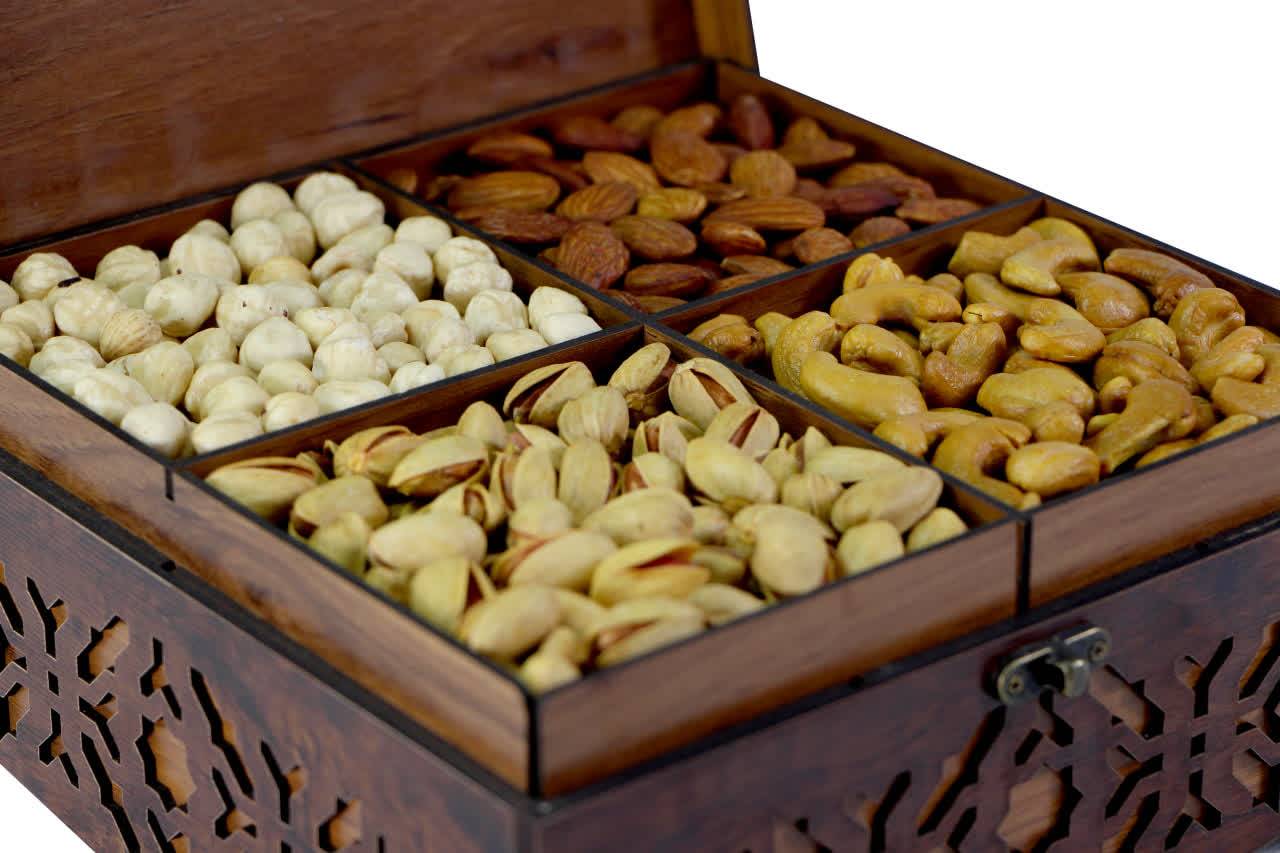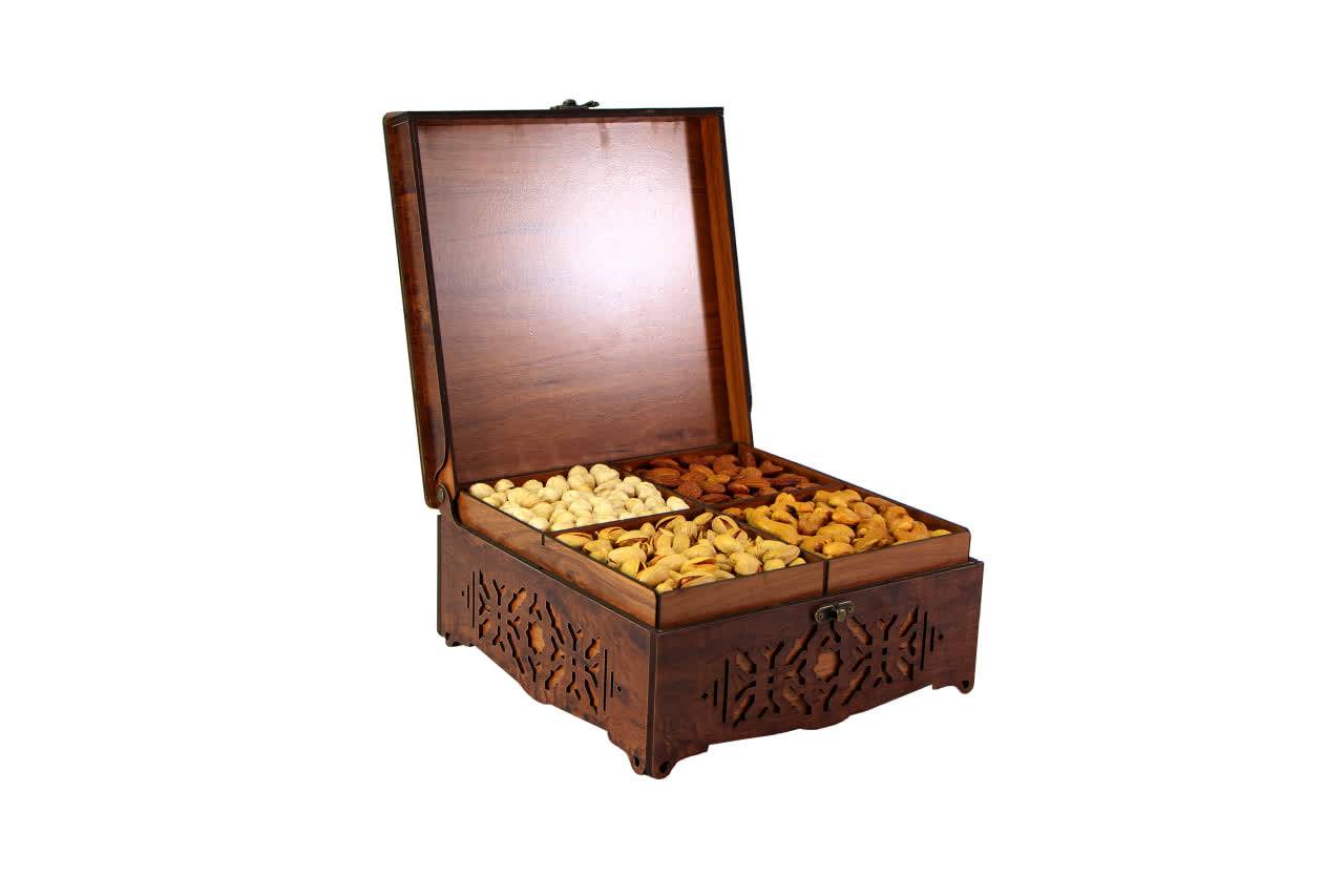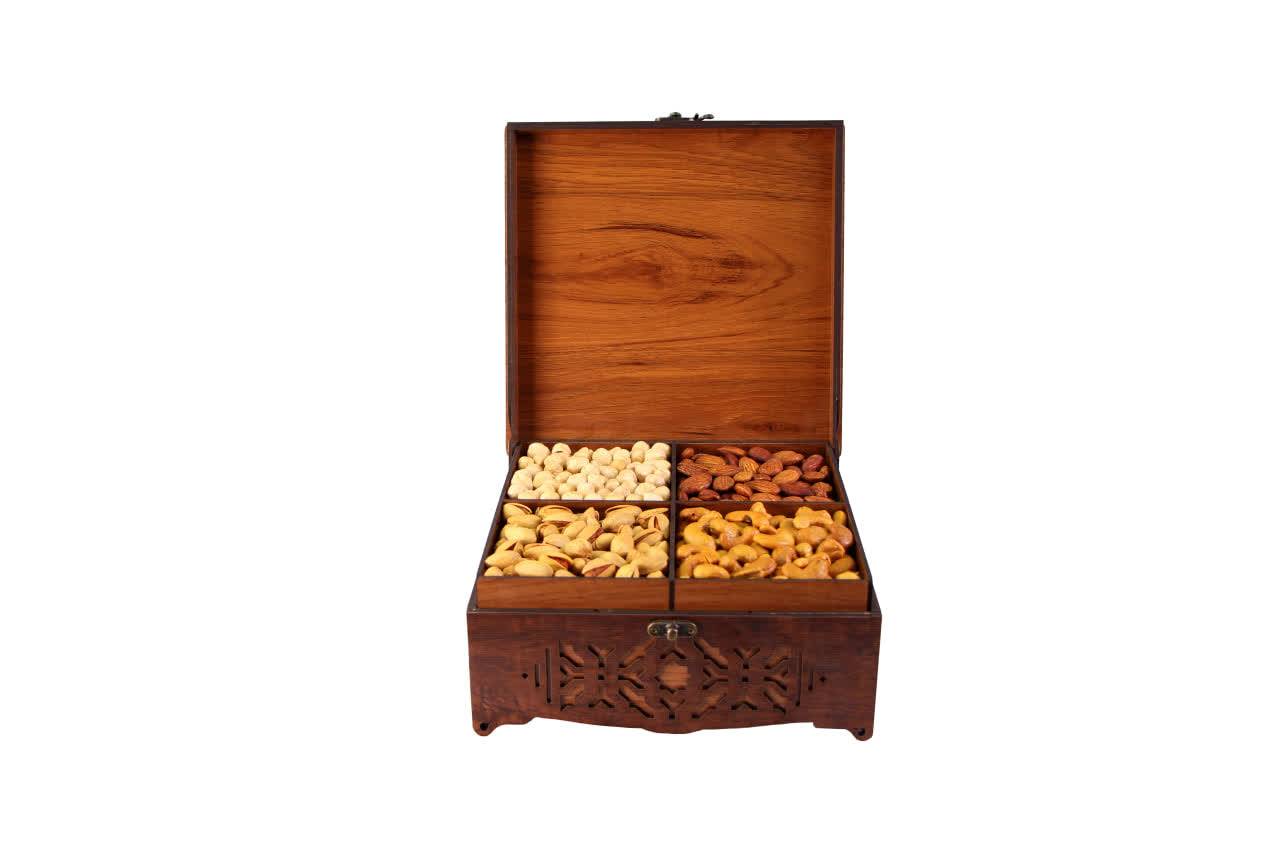 جعبه با طرح سنتی در ابعاد 23*23*10 حاوی 1500 گرم آجیل چهار مغز اعلا امکان سفارش جعبه به تنهایی نیز میباشد