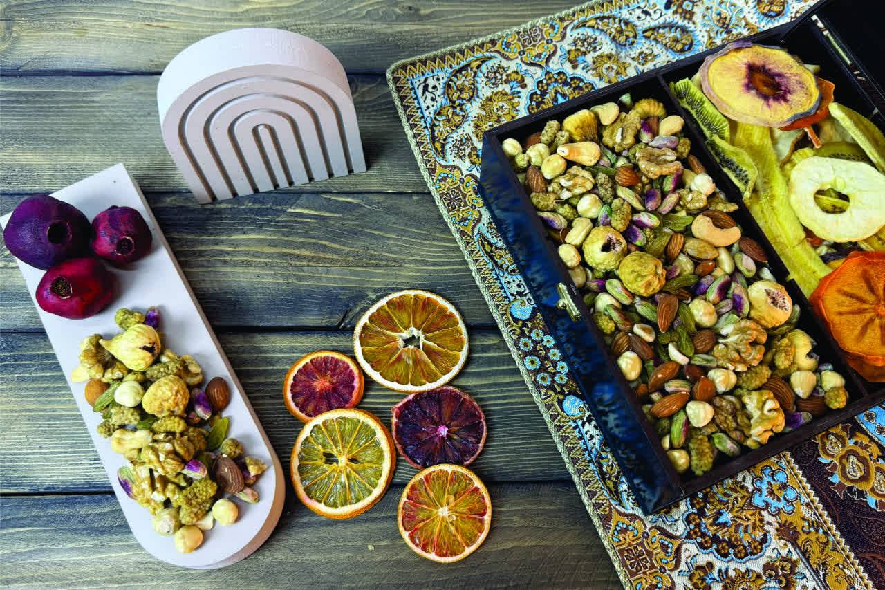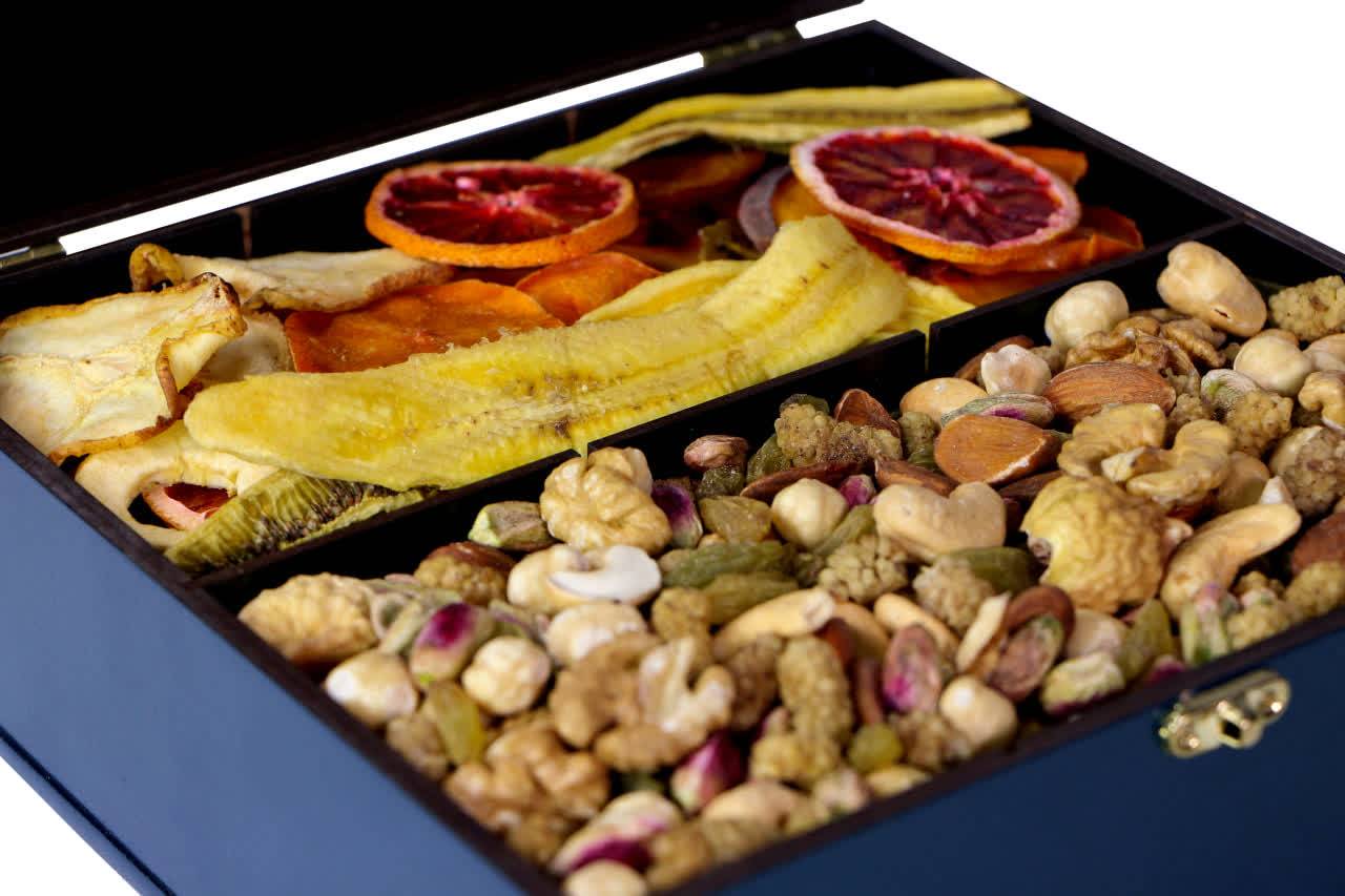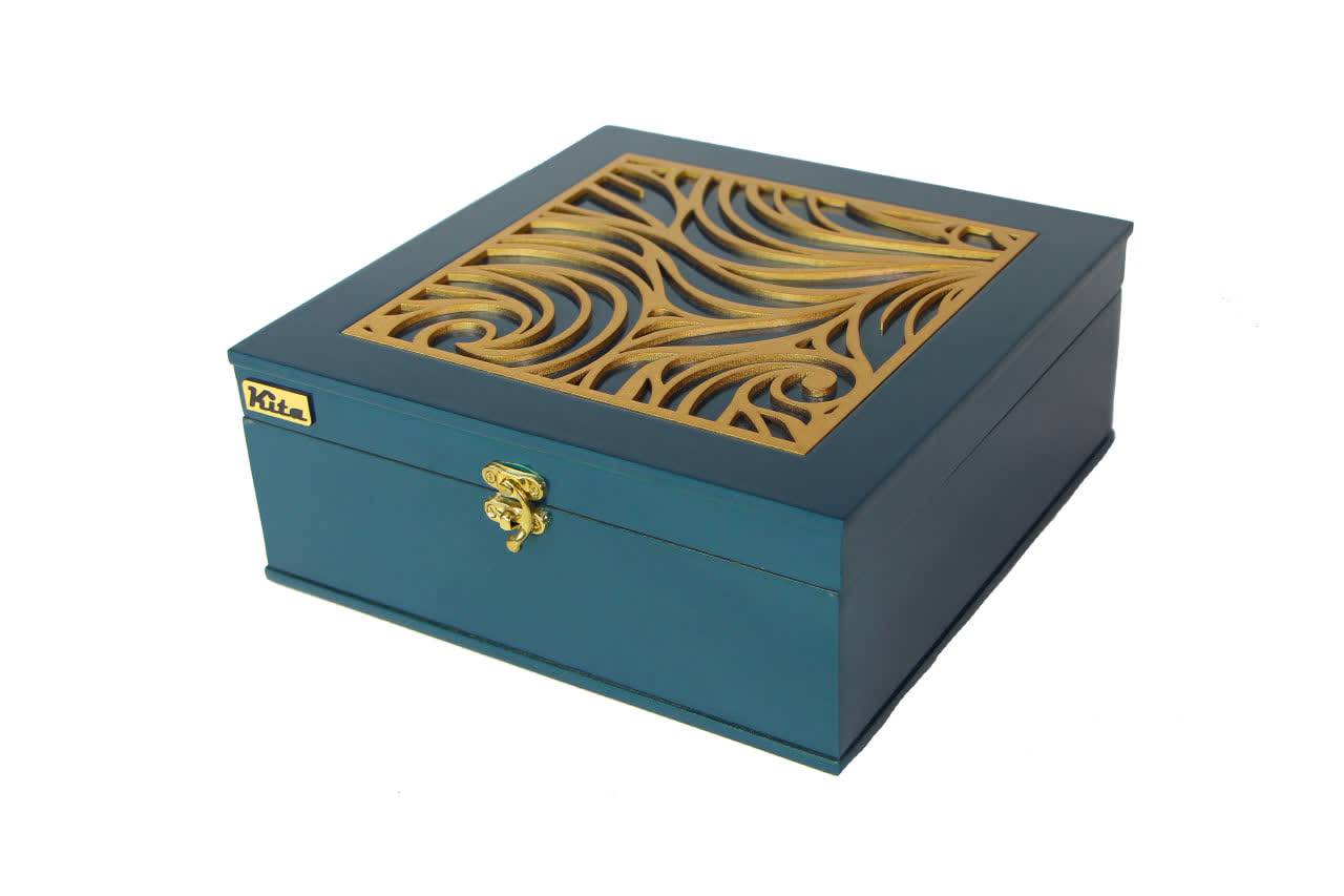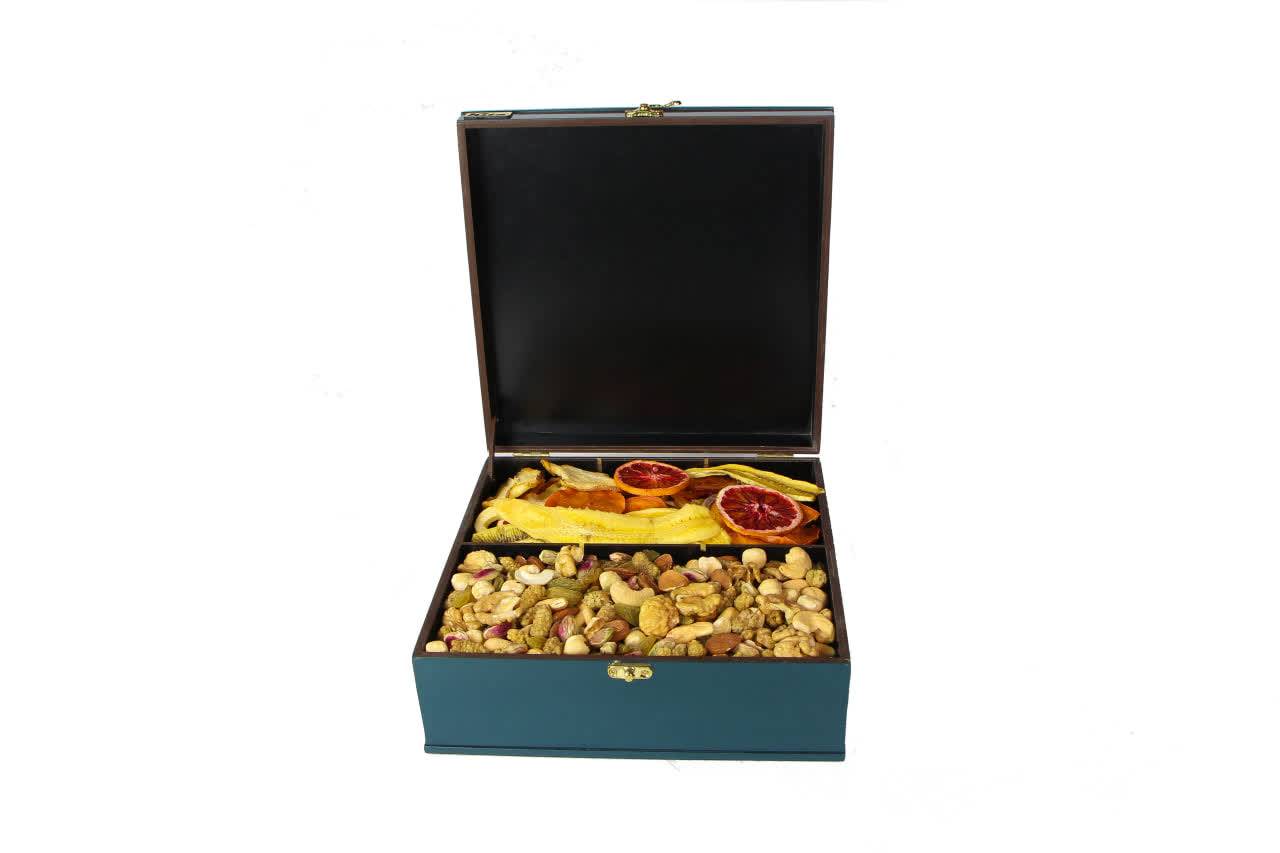 جعبه با طرح برجسته و امکان تغییر در طرح روی جعبه در ابعاد 23*23*9 حاوی700 گرم آجیل شیرین 350 گرم میوه خشک اعلا امکان سفارش جعبه به تنهایی میباشد