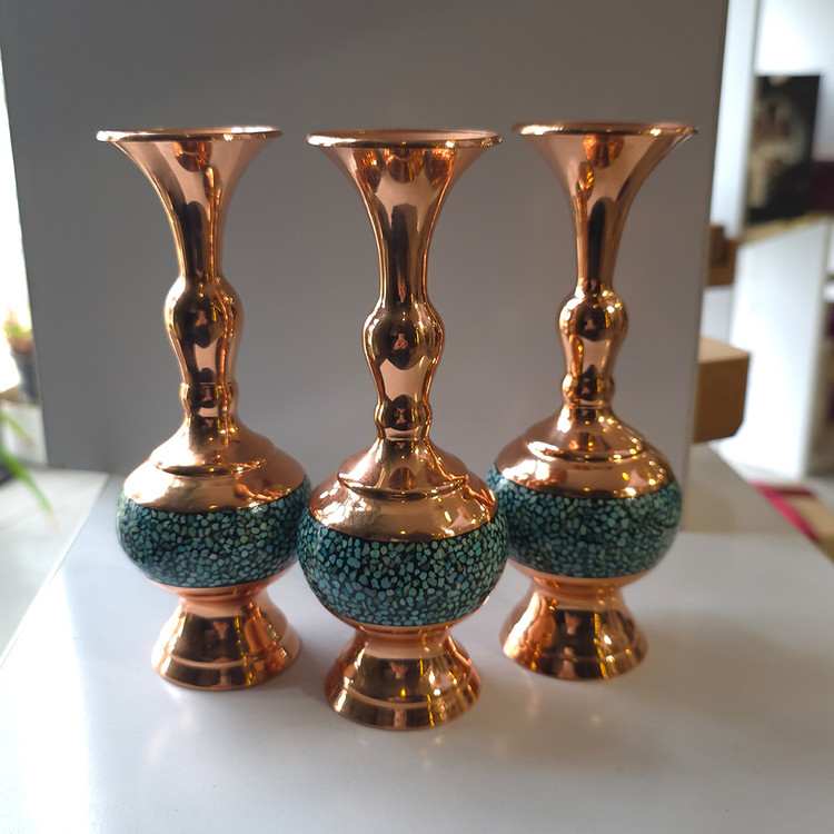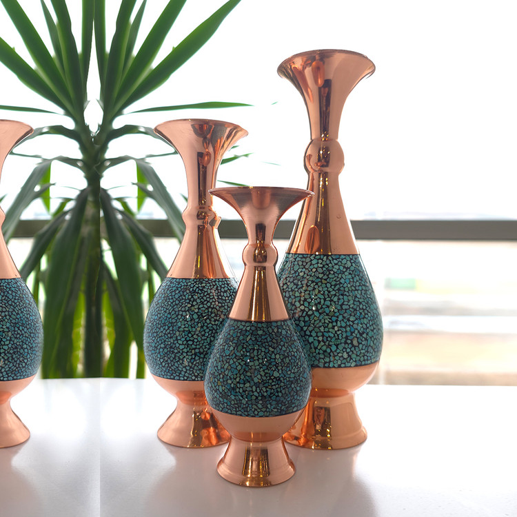 گلدان صراحی فیروزهکوبی یکی دیگر از محصولات صنایع دستی هنرمندان آپادانا است که با فرم اصیل صراحی و تزئین سنگهای طبیعی فیروزه، جلوهای باشکوه و ماندگار به دکوراسیون داخلی میبخشد. چیدمان دقیق قطعات فیروزه بر بدنه فلزی و پرداخت نهایی درخشان، نشاندهنده مهارت و ظرافت هنرمندان این هنر اصیل ایرانی است. این گلدان انتخابی ارزشمند برای تزئین فضاهای رسمی، پذیرایی و هدیهای نفیس از صنایع دستی ایران به شمار میرود.